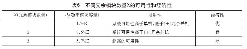 可見雖然冗余數(shù)量X越大,系統(tǒng)可用性越高;但功率模塊容量P0越小。系統(tǒng)總模塊數(shù)量k+X越大,系統(tǒng)經(jīng)濟(jì)性越差。為兼顧系統(tǒng)的可用性和經(jīng)濟(jì)性,必須在一定的可用性指導(dǎo)下,合理選擇模塊數(shù)量。表6給出了不同冗余模塊數(shù)量X的可用性和經(jīng)濟(jì)性。