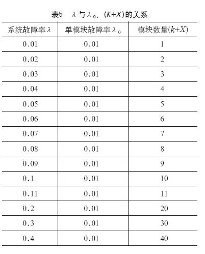 系統(tǒng)故障率λ與單模塊率λ0、模塊數(shù)量(k+X)的關(guān)系見表5。