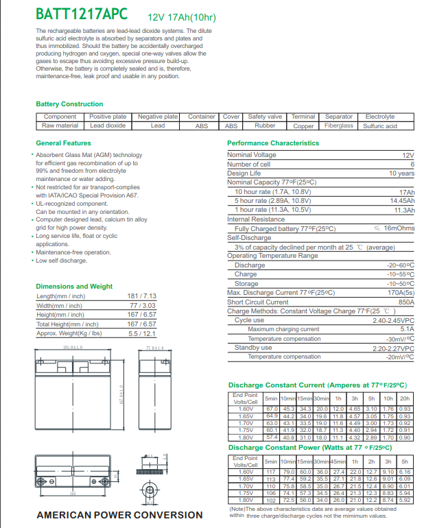 APC電池BATT1217APC物理參數(shù)(高167mm寬77mm深181mm凈重5.5kg)