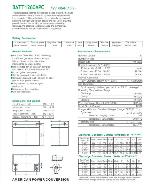 APC電池BATT1260APC物理參數(shù)(高206mm寬166mm深258mm凈重24kg)